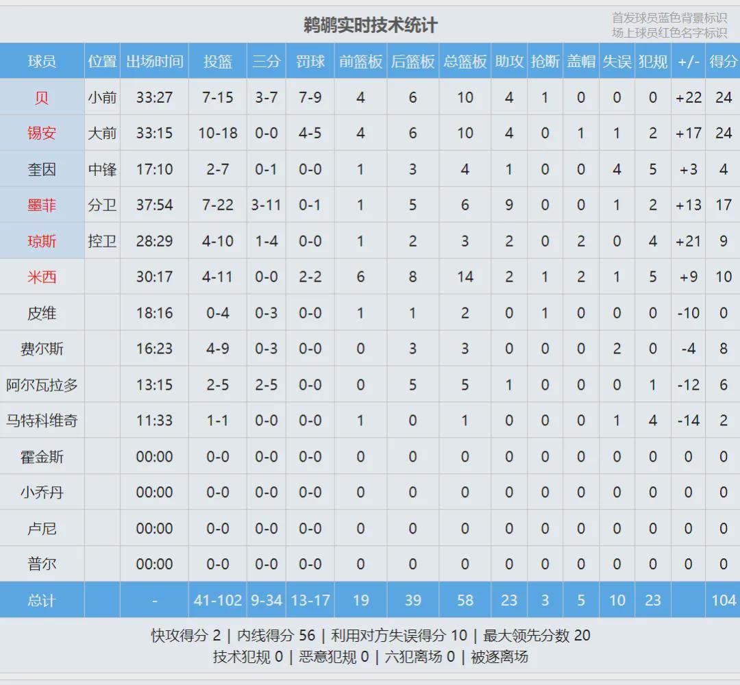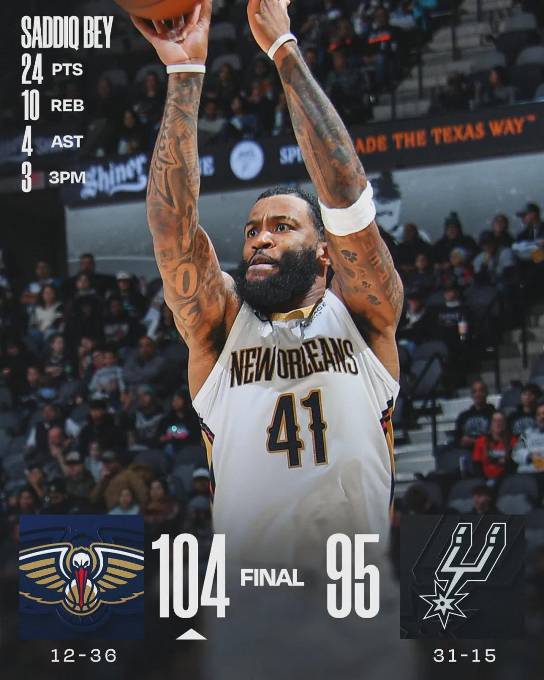 四节比分(鹈鹕在前):25-28、31-19、26-21、22-27。第四节马刺轰出一波24-5,一度完成反超。但鹈鹕还了一波13-0,直接带走比赛胜利。福克斯8中4得到12分7助4失误,罚球4中1;卡斯尔投篮6中1仅得5分4板5助2失误。