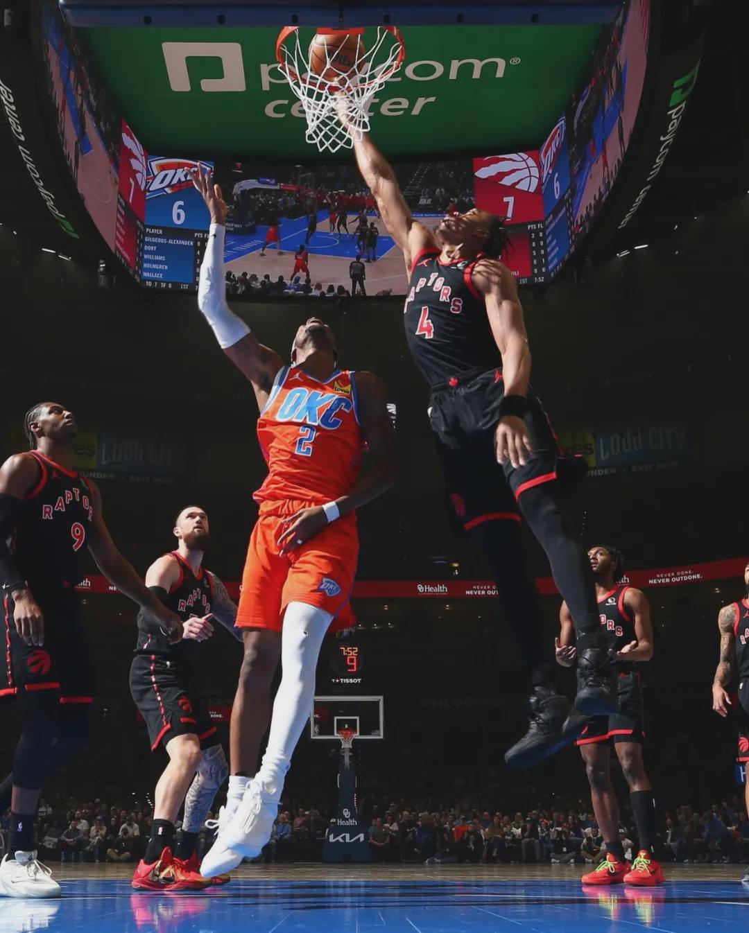 我们先来说说雷霆和猛龙这一场,本赛季的猛龙并不弱,长期排名东部前三。四节比分(猛龙在前):25-30、29-20、25-31、24-20。末节最后2分钟,奎克利两记大心脏三分帮助猛龙反超,最后28秒斯科蒂-巴恩斯大帽霍姆格伦!